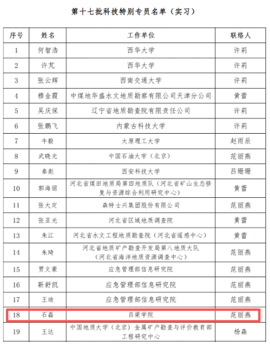 近日,中关村绿色矿山产业联盟(简称中绿盟)公布第十七批绿色矿山科技特别专员名单,我系石磊副教授成功入选。后续将以科技特别专员身份参与绿色矿山领域产学研用深度融合工作,助力矿业生态绿色低碳高质量发展。